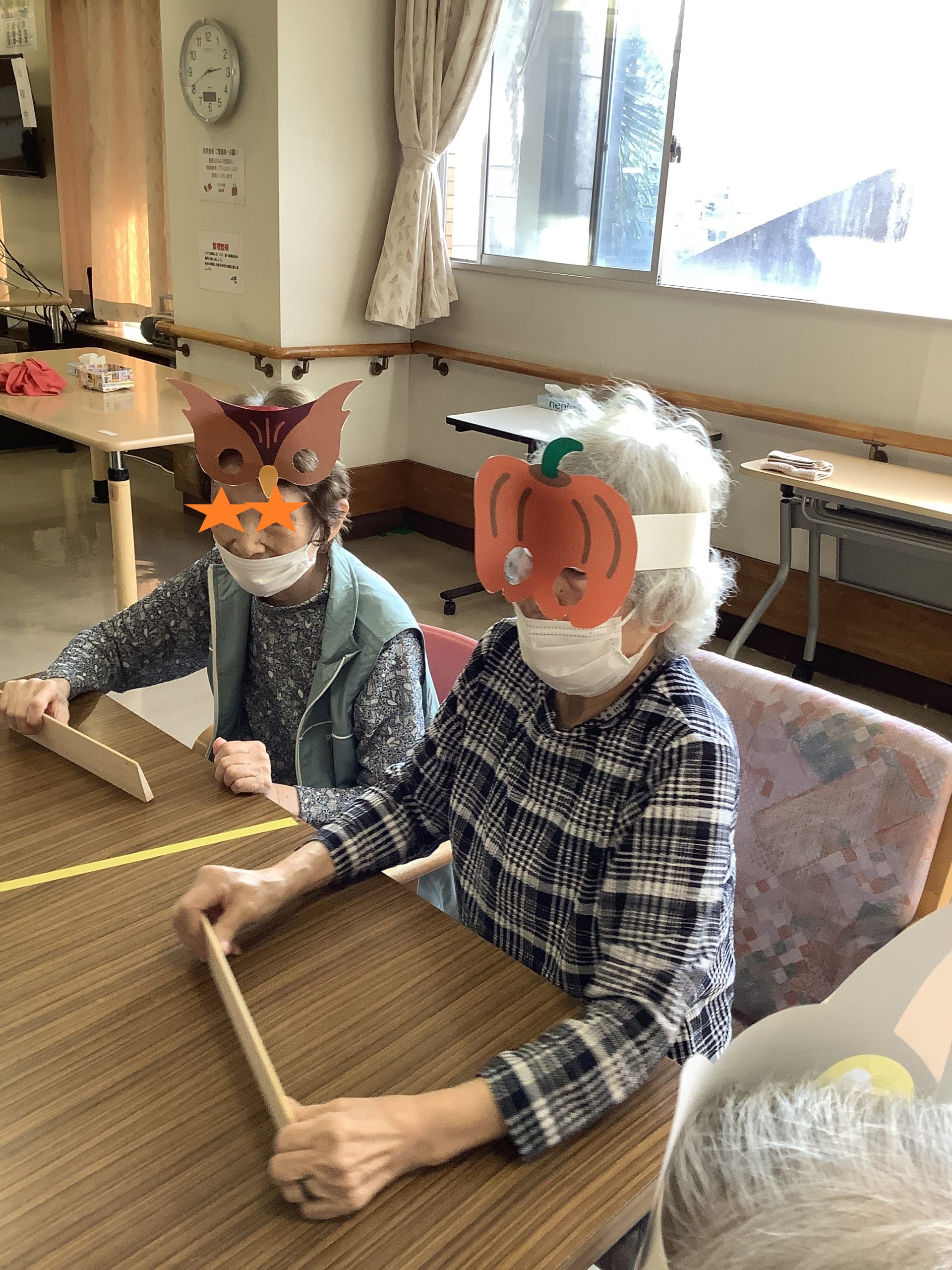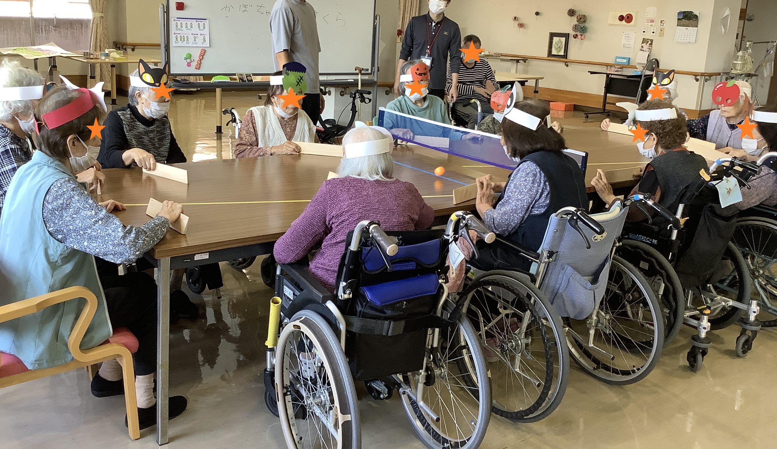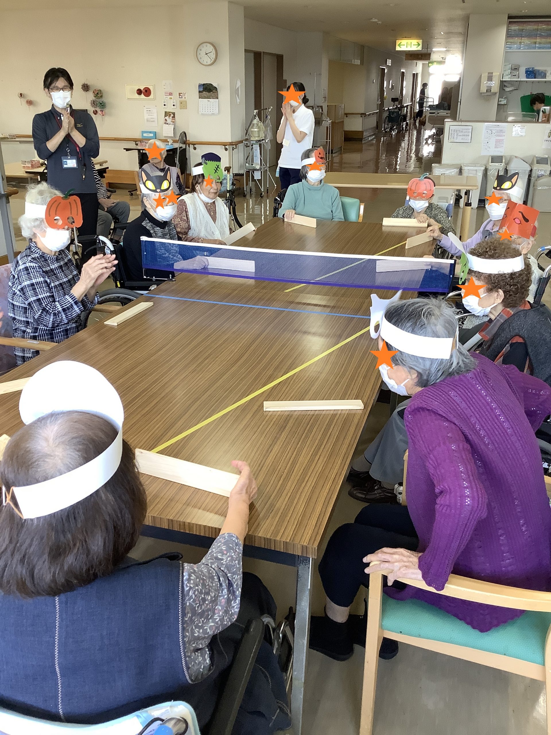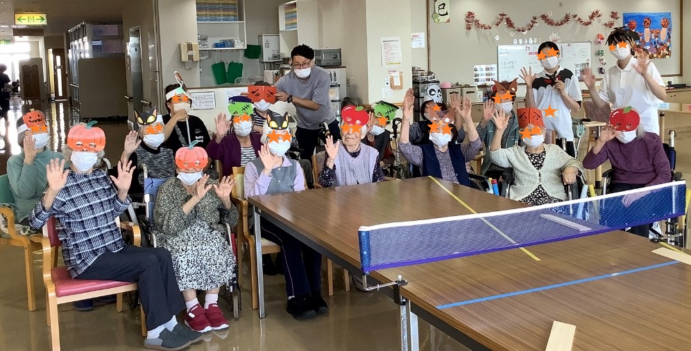 今回は、ハロウィンのお面を装着して卓球バレー大会を開催しました!