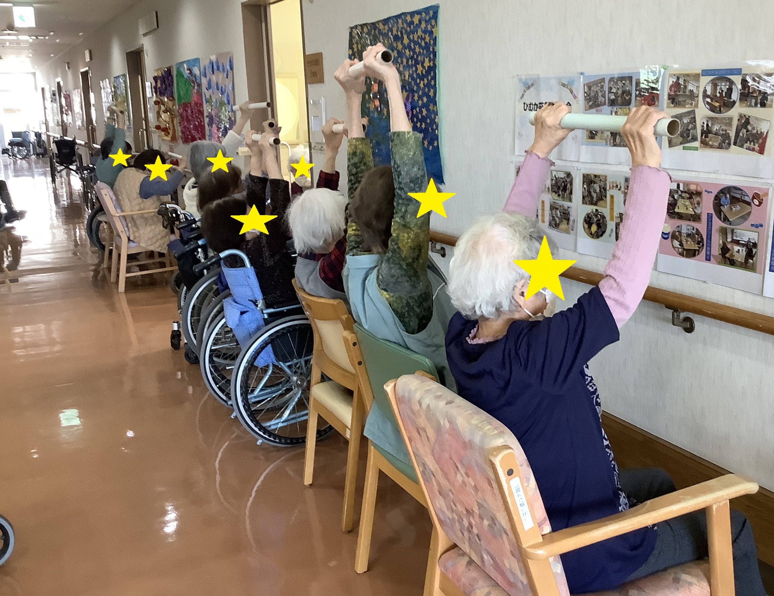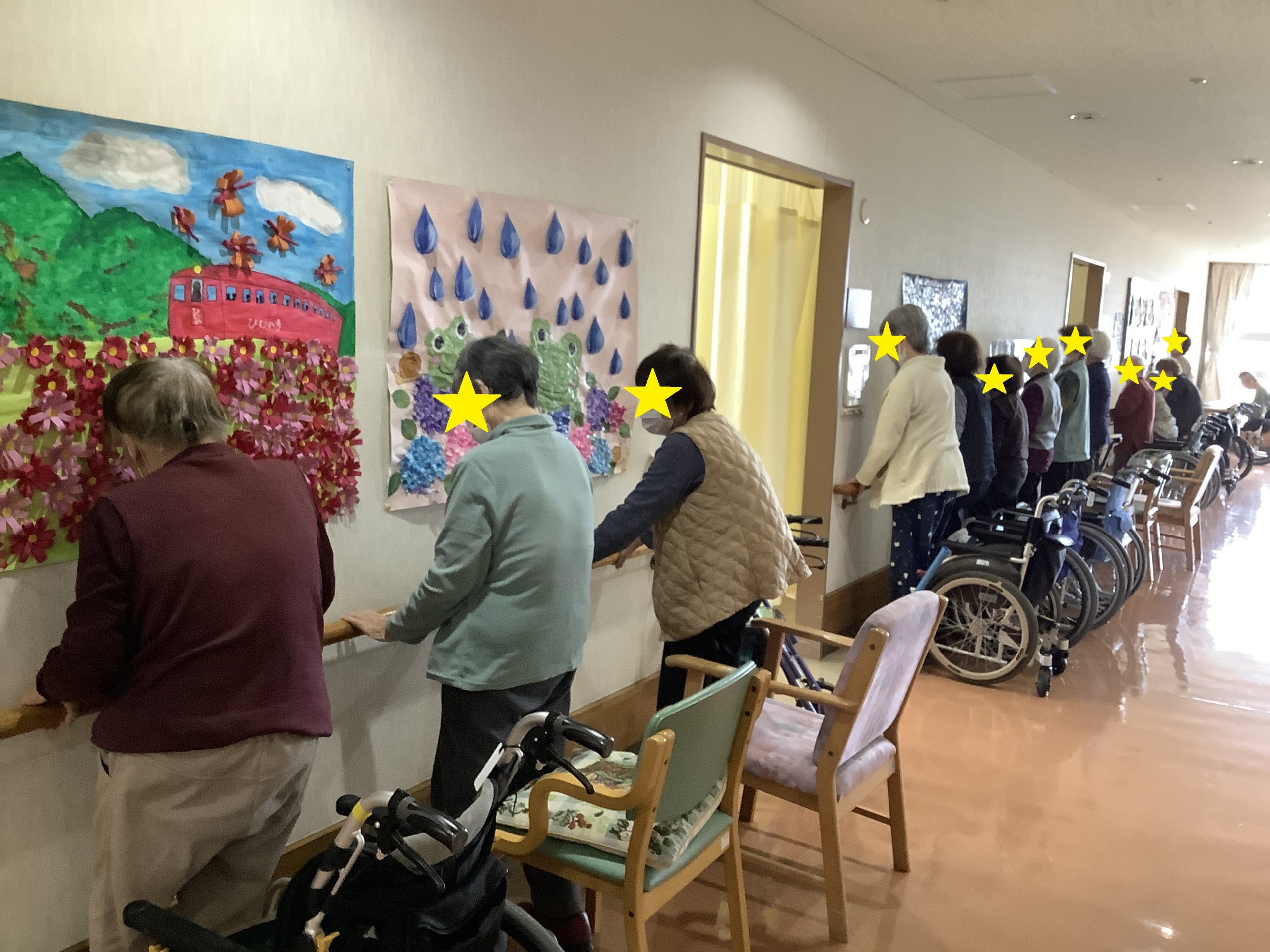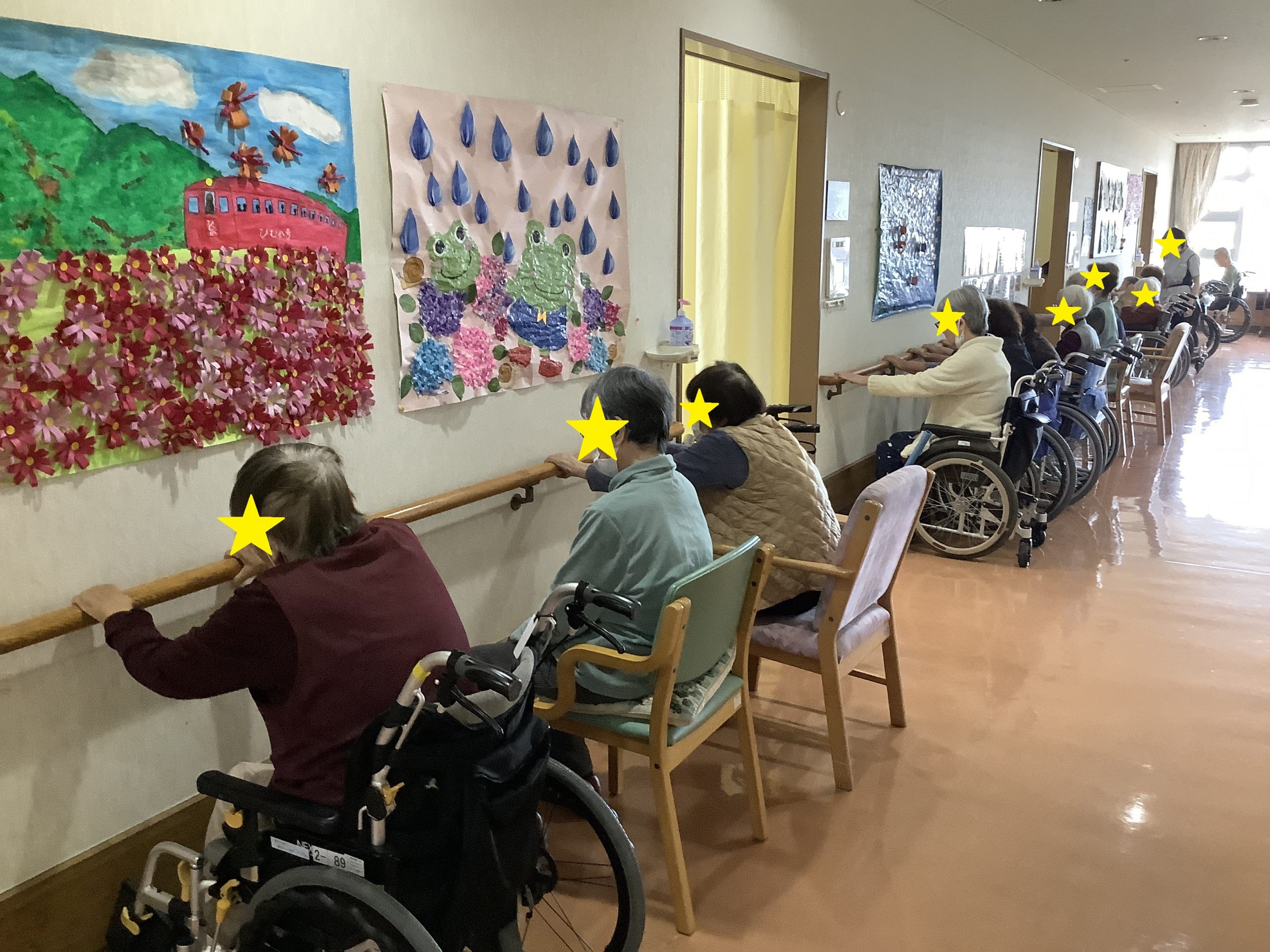 廊下での「自主練習の会」 廊下で行っている立ち上がりの自主練習の会に、さらに多くの方が参加してくれました。 最近は参加人数もぐんと増えて、みなさんとても意欲的です。 立ち上がり訓練だけでは物足りなくなり、 ついに棒体操もスタート! 待望の男性利用者の参加もあり、ますます活気が出てきました。 「今日の努力が、明日の元気につながる」 そんな思いを共有しながら、笑顔で体を動かしています。 これからも、みんなで楽しく続けていきます!