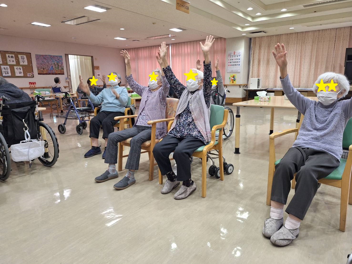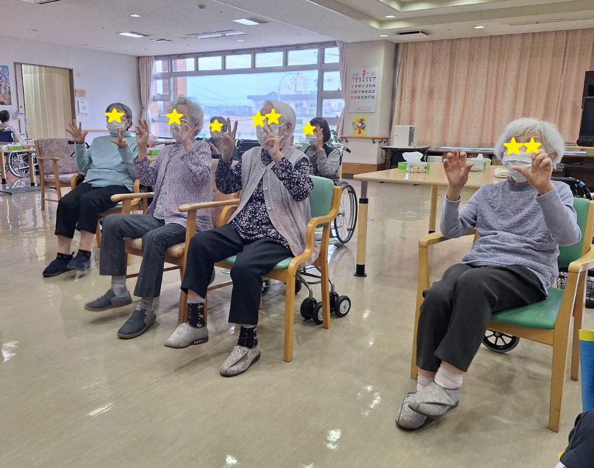 手洗い体操や足踏み体操など、 楽しみながら自然と身体を動かすことができ、 参加者の皆さまも笑顔いっぱい。