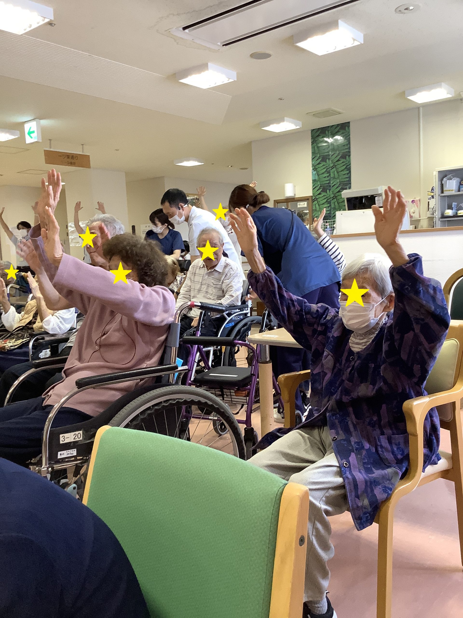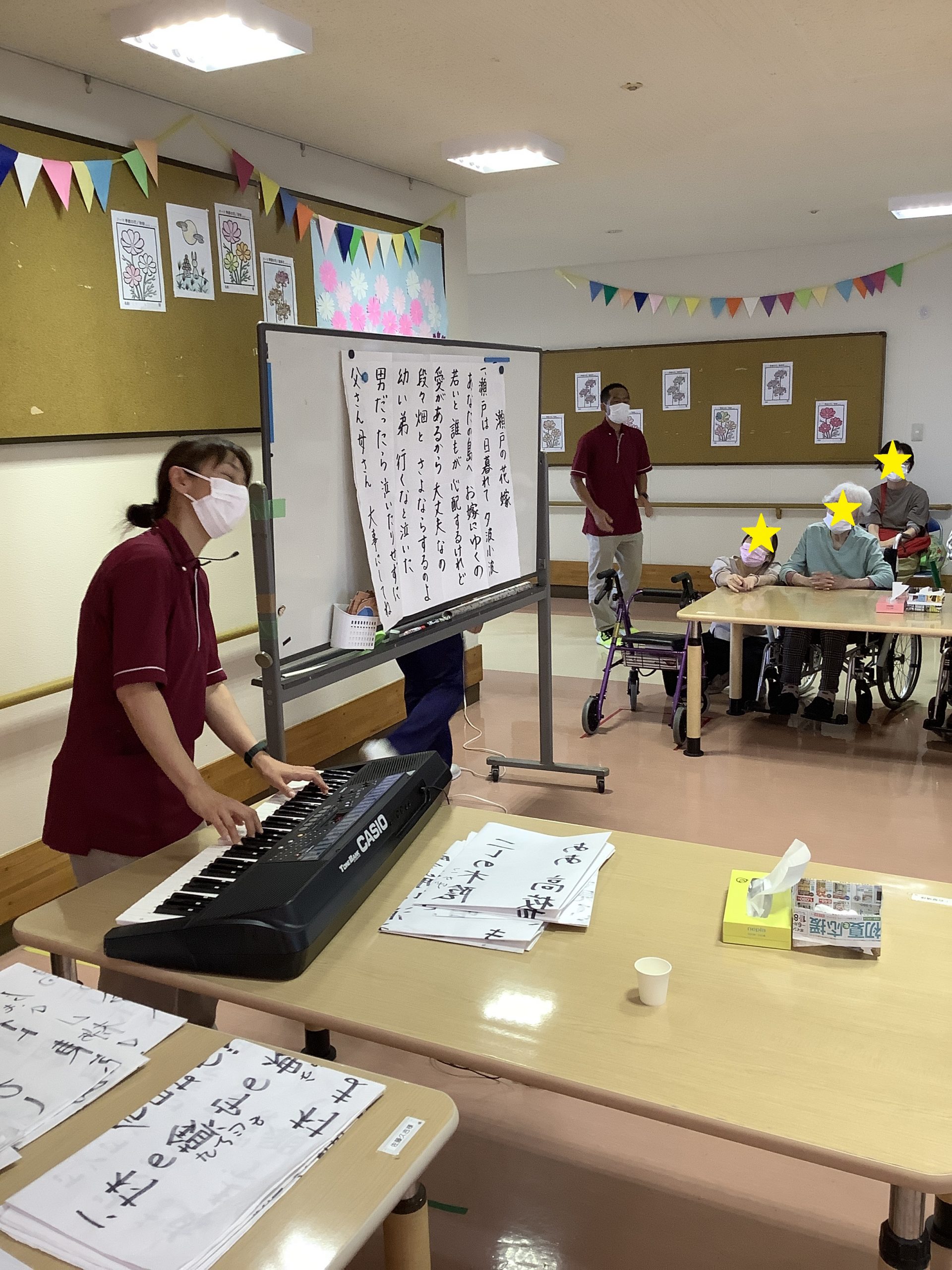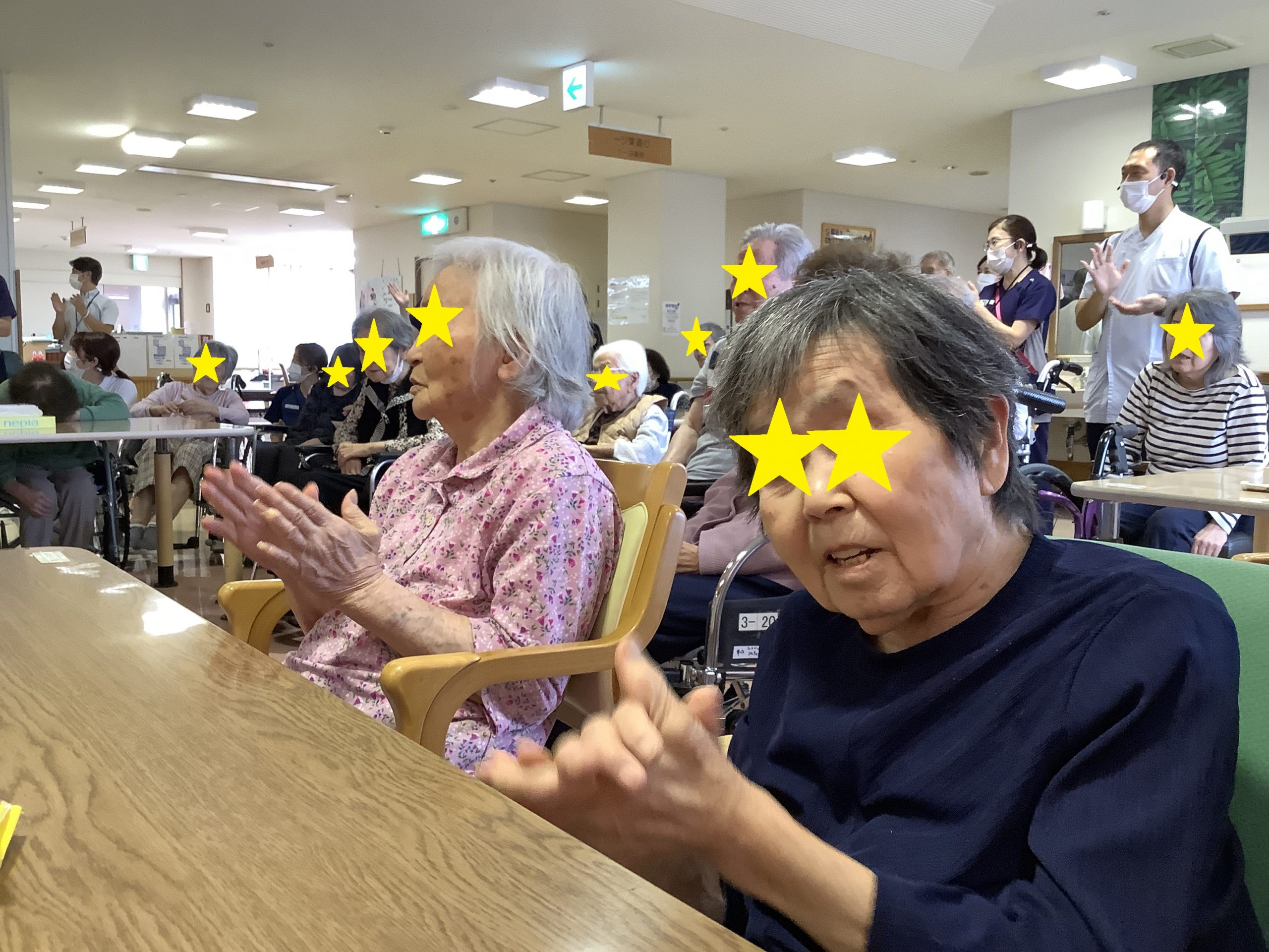 懐かしい曲が流れると自然と口ずさまれたり、手拍子をされたりと、音楽の力を改めて感じるひとときでした。普段あまり発語の少ない方が歌を口ずさむ場面もあり、職員一同とても嬉しく思いました。